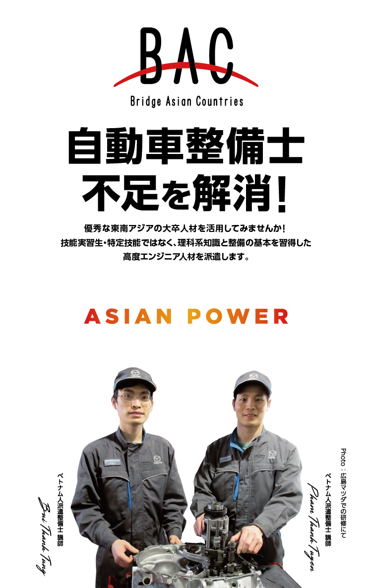ベトナムで理科系大学卒業生(自動車工学・機械など工学系学部出身者)を選考・採用し、日本語及び自動車整備基礎を弊社ハノイ研修センターで8か月間研修。研修修了後日本に入国し、販売会社(広島マツダ)で7か月(習得習熟が早い者は、1期生実績で最短5か月)のサービス研修と就業実務を行った後、契約に基づき各社へ「派遣整備士」として派遣します。